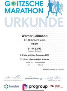 Von unserem Verein haben sich nur noch zwei Starter für den Fläminglauf entschieden. Beide gingen auf die 12 km Strecke. Maik war nach 54:51 min im Ziel und Werner holt sich souverän den Sieg in der M 70 nach 1:02:22 h.🍀👍