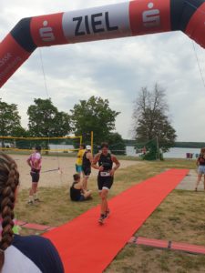 Pünktlich 12 Uhr zur Mittagshitze durfte Katja in den See springen, der Dank des aufkommenden Windes wieder „schöne“ Wellen bereithielt. Nach 750m im Wasser (naja, durch den Wind wurden die Bojen näher zum Strand getrieben und die Schwimmstrecke dadurch deutlich kürzer) ging es auf die Radstrecke, bei der gefühlt 3 Föne um einen pusteten und die Hitze schon sehr anständig sowohl unter dem Helm als auch auf die Oberschenkel drückte. Dank nicht-ganz funktionierender Schaltung durfte ich dann auch nur in den höchsten Gängen in die Pedalen treten. Auf der Laufstrecke gab es dann Gott sei Dank viel Wasser, um die gefühlten 65° die vom Asphalt hochdrückten, einigermaßen gut zu überstehen. Mit einem 13. Platz bei den Frauen war ich bei den Temperaturen ganz zufrieden.