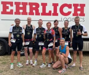 Sandra Petersohn wird Landesmeisterin🥇 in der W 45 nach 1:19:22 h und Annett Näser belegt hier den 4. Platz. 👍🤗Susanne Kluge holte sich in der W 60 ebenfalls den Titel🥇 nach 1:35:33 h. Unser schnellster Mann war in diesem Jahr Sebastian König mit 1:09:25 h, was gleichzeitig der 3. Platz 🥉in der AK 3 bedeutet. Auf den 3. Platz 🥉bei den Senioren 2 kam Michael Hopp nach 1:11:37 h. Jörg Petersohn drehte erst nach dem Schwimmen auf und belegte mit 1:18:49 h den 4. Platz bei den Senioren 3. Volker Kluge belegte in der M 60 den 1. Platz 🥇mit 1:28:35 h.