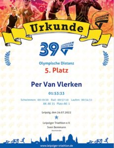 Leider traf uns in diesem Jahr die Triathlon – Weisheit: um es bis in das Ziel zu schaffen muss man erst einmal bis an die Startlinie kommen🤔💪. Leider hatten wir schon vorher drei Kranke🤧🤒 und dazu kam noch ein Verletzter🤕 der wenigstens zwei Disziplinen machen konnte. Unser Verein war trotzdem gut vertreten, bei der mit 1400 Teilnehmern ausverkauften Veranstaltung. 😂Die Leipziger haben diese Veranstaltung zum 39. Mal😳 durchgeführt und sogar der Präsident der Deutschen Triathlon Union war den gesamten Tag anwesend🤗. Mit Temperaturen von über 30°🌞 war es traditionell heiß😓 und beim Sprint gab es natürlich Neoverbot. Aber der Reihe nach. Unser Champion – Per van Vlerken – hat die olympische Distanz schon sechs Mal gewonnen und ging wieder als Local Hero an den Start. Obwohl ein Jahr älter😉, hat er fast die identischen Teilzeiten und somit auch die Zeit von 2021 erreicht. In dieser Leistungsklasse kann man den Rückstand den man beim Schwimmen aufgebrummt bekommt ganz schwer wieder aufholen. Per war natürlich schwer am Kämpfen und versuchte alles. Mit Platz 5 im Gesamteinlauf und dem ersten Platz 🥇in der Altersklasse 35 waren wir sehr zufrieden💐 ~ seine Endzeit 1:53:33 h. Unser Micha probierte sich nach den Landesmeisterschaften auch gleich wieder auf der Olympischen aus. Er erreichte mit 2:17:31 h seine zweitbeste Zeit🤝 die er je in seiner Triathlon Karriere erreicht hat. Platz 9 in der AK 45 – er ist bei diesem Starterfeld sehr zufrieden👍🤗Annett 🍑war trotz ihrer beruflichen Verpflichtungen👮 froh endlich wieder in ihrer Heimatstadt am Start stehen zu können. Sie machte ein sehr solides Rennen und war nach 2:56:48 h im Ziel. Der sechste Platz🙋🏻♂️💪 in der AK 45 lässt hoffen und macht ihr Mut für das weitere Training. 😂 Denn im nächsten Jahr steht sie mit uns in Roth am Start. 😉🤗 Am Nachmittag, bei noch etwas höheren Temperaturen, standen wir zu dritt beim Sprint am Start. Am eiligsten hatte es Basti. Nach 1:03:28 h kam er als 10. im Gesamteinlauf und als dritter in der M 30 in das Ziel. Da in Leipzig nur die ersten zehn im Gesamteinlauf M/W zur Siegerehrung gerufen werden, war er zum ersten Mal auf dem Podest. Schon toll mit all den Profis. Susanne, nun schon in der W 60 startend😳, holte wie immer beim Rad🚴🏻♂️ gewaltig auf. Trotz der Knieprobleme kämpfte sie sich durch und holte den dritten Platz in der Altersklasse. Nicht auszudenken was sie erreicht, wenn das mit dem laufen noch klappt. 🤔 Insgesamt können wir sehr zufrieden sein und schauen optimistisch in die Zukunft. Unser Ziel ist es auf jeden Fall bei der Jubiläumsveranstaltung 2023 wieder mit einer großen Gruppe am Start zu sein. Hoffen wir, dass die rot😡 grünen🤮 Vasallen🧌🧑🏽🦯 in Berlin bis dahin nicht das Land komplett gegen die Wand gefahren haben und ihre Verbote den Sport noch mehr behindern. 🤢🥴