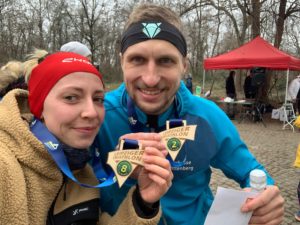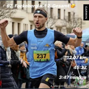 Dank meiner Freundin ging es am vergangenen Samstag zum 62. Fockeberglauf. Die Wettkampfstrecke umfasst 12 Kilometer mit 270 Höhenmeter. Diese werden auf 6 Runden aufgeteilt. Durch die lange Warteschlange am Anmeldebereich viel das Warmlaufen so gut wie weg und wurde auf dem Weg zum Auto, bzw. auf dem Rückweg zum Start erledigt. Dann fiel der Startschuss für die 427 Starter bei ca. 5 Grad Außentemperatur. Schnell hat sich das Feld sortiert und ich versuchte auf mein Körpergefühl zu hören und mein Tempo zu laufen. So hatte ich nach dem ersten Kilometer, welcher nur Bergauf ging, viele übereifrige Teilnehmer eingesammelt. Zu diesem Zeitpunkt war mir nicht klar, welche Position ich im Feld des Hauptlaufes habe. Weiter ging es gemäß Körpergefühl und mit der Beobachtung, dass die Läufer, die noch vor mir waren, ziemlich mit den Bergauflaufen ihre Probleme hatten. Dort konnte ich konstant Zeit gut machen. In der vorletzten Runde überholte ich den Gesamtdritten ungefähr auf der Hälfte des Anstieges. Dann bekam ich vom Coach Per den Hinweis: „Du bist 3.!!! Da vorne ist der 2. !!!“. Permanent musste die Konzentration hochgehalten werden, da auch beim herunterlaufen/herunterfliegen viele Überrundungsmanöver anstanden. So ging es in die Schlussrunde. Beim letzten Anstieg, mit Gegner im Blickkontakt zog ich mich förmlich an den Zweitplatzierten heran, lief ein paar Schritte mit Ihm und überholte kurz vor Ende des Anstieges. Dann hieß es durchziehen bis zur Ziellinie. Total zufrieden überquerte ich diese in 45:44 Minuten. Fazit: Der Körper hat die Magenkrämpfe in der Woche gut verkraftet und war zu einer top Leistung fähig. Des Weiteren waren fast alle 6 Runden identisch schnell, nur die 1. und die letzte waren minimal schneller. Völlig Happy ging es auf das 1. Podest für dieses Jahr. Der Leipziger Triathlon Verein hat wieder eine Top Veranstaltung durchgeführt.