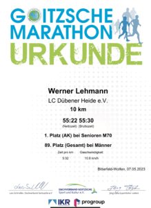 Die 10.000 m in Pretzsch waren in diesem Jahr nicht ganz so stark besetzt. Mit 60 Starter hatte man jedoch doppelt so viele wie bei der Landesmeisterschaft. Die Grün-Weißen geben sich viel Mühe und haben eigentlich etwas zu moderate Organisationsgebühren. Was man von einigen anderen Ranglistenläufen in Wittenberg nicht sagen kann.