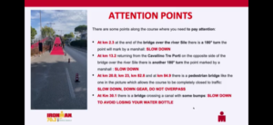 Die Strecken sind sehr einfach. Schwimmen im Meer parallel zum Strand, Radfahren komplett flach mit zwei extra gebauten Brücken über wichtige Straßen und Laufen drei Runden direkt am Strand beziehungsweise parallel dazu in der Einkaufsstraße.