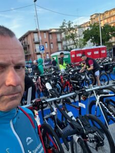 Nach dem ich im Block zum Rolling Start tatsächlich 1 Stunde warten musste (habe mich mit der Zielzeit 34-40 Minuten wohl falsch einsortiert) war das Schwimmen mit 31:08 min. zufriedenstellend. Danach gab es einen relativ langen Weg zur Wechselzone inklusive Brücke über die Radstrecke in die Wechselzone hinein. Radfahren war dann aufgrund der großen Teilnehmerzahl am Anfang sehr voll und die Italiener und vor allem die Staffelfahrer haben offensichtlich vom Windschattenverbot nichts mitbekommen. Kampfrichter waren auf dem engen und winkligen Kurs leider kaum zu sehen. Nach 2:23:59 h war ich zufrieden wieder in der Wechselzone. Beim Laufen wurde es dann hart. Hier fehlten die Kilometer, so dass ich froh war, am Ende nach 1:40:56 h und einer Gesamtzeit von 4:46:40 als 41. in der Altersklasse im Ziel zu sein. Darauf lässt sich aufbauen und der Ironman in Klagenfurt am 18.6. ist in nicht allzu weiter Ferne.
