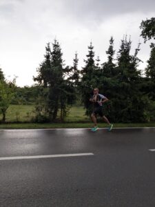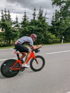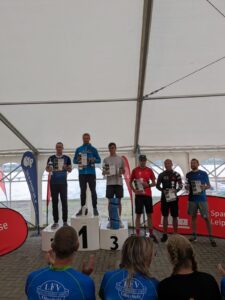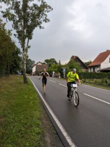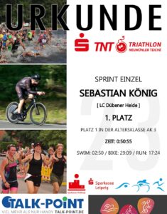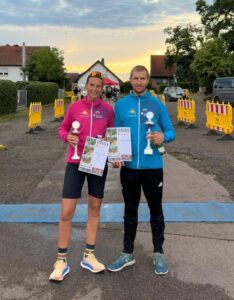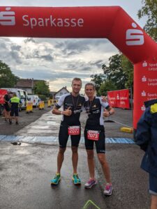 Basti hatte traditionell nach dem Schwimmen etwas Rückstand und drückte dann beim Radfahren kräftig in die Pedalen. Bei Regen und Hagel war es nicht ganz ungefährlich – wer gewinnen will muss natürlich ein gewisses Risiko eingehen. Dann kam zum ersten Mal die Situation, das er direkt hinter dem Führungsmotorrad war. Ein Hammer – Euphorie!! Mit der zweitbesten Radzeit und der schnellsten Laufzeit brachte er seinen ersten Gesamtsieg nach Hause. Eine tolle Leistung der beiden – Gratulation!!