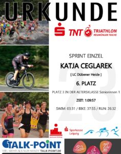 Hier ein kurzer Bericht von Katja: „Mal was kurzes machen“ hat der Kopf gesagt -nach dem langen Marathontraining. Also ging es spontan mit Bruderherz Basti zum Sprint Triathlon nach Schildau. Baden durften wir nur ganz kurz, da das Gewitter immer schneller heranzog mussten alle schnell aus dem Wasser. Rauf aufs Rad und es war wieder ordentlich Wind. Es lief – rollte trotzdem supi… nach ca. 10 km ein ordentlicher Hagelschauer, mit Blitz und Regen was nur ging. Weiter rollen bis 20 km erreicht waren. Die Schuhe sind komplett vollgelaufen mit Wasser…aber was soll’s… aufgeben kam nicht in Frage. Es mussten ja alle durch. Zusätzliche Motivation habe ich bekommen als ich Bruderherz auf Platz 1 fahrend gesehen habe. Also noch mehr Ehrgeiz entwickelt um auch aufs Podium zu kommen, denn dort werden die ersten 6 geehrt. Die anschließende 5 km Laufrunde könnte schneller sein, aber wir wollen nicht unzufrieden sein, denn es hat tatsächlich zu Platz 6 bei den Frauen gereicht und somit der erste Pokal im Triathlon. Megaaaaaaa happyyyy & jeder Wettkampf ist besser als jedes Training.
