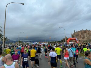 Jörg und Sandra hatten sich zum Saison Abschluss den Lauf auf der Insel 🌞🏝️ausgesucht. Wir waren vor Jahren schon einmal gemeinsam dort und fanden die Veranstaltung sehr schön. Vor allem raus aus dem Schmuddelwetter und ab in die Sonne. Ja Sonne gab es bis Samstagabend – Sonntagmorgen wurde Jörg durch lautes Trommeln am Fenster geweckt. Dazu plätscherte es noch im Bad, fix nachgeschaut, oweia😳 es regnet in Strömen und scheinbar kommt das Wasser auch über die Fassade. Also fließend Wasser aus der Wand. 😜🤨 Zum Start um 9:00 Uhr hörte es langsam auf, jedoch waren auf den Straßen große Pfützen und der neue Kurs durch die verwinkelte Innenstadt von Palma wurde dadurch sehr rutschig. Jörg war froh, dass er nur eine Runde laufen musste😉👍, so dass er den Halbmarathon in ihn für ihn sehr ansprechenden 1:43 h absolvierte. Sandra hatte einen lockeren Start mit einem Sprint nach 3 km in die Büsche🤭💪 um dann erleichtert 😮‍💨 wieder Fahrt aufzunehmen. Wie schon sehr oft bei Marathons gezeigt, läuft sie fast wie ein Uhrwerk, so dass die Durchschnittszeiten sehr gleichmäßig waren. Erst auf dem zweiten Teil der zweiten Runde wurde es langsamer da zu dieser Zeit, in den engen Gassen von Palma, jetzt die Touristenströme🥱 unterwegs waren, so dass Slalom laufen und gut orientieren viel Zeit kosteten. Nach 3:28:05 Stunden erreichte sie das Ziel unterhalb der Kathedrale. Als achte Frau im Gesamteinlauf und dem 1. Platz 🥇 in der Altersklasse W 50 kann man nur gratulieren. Toll gemacht, ihr beiden. 🤗🤗💐