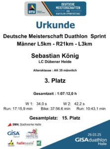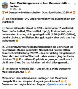 Basti machte ein couragiertes Rennen (seine Einschätzung lest ihr auf einem Foto) und belegte den 3. Platz in der M 35. Holm war zum ersten Mal bei einer Duathlon DM am Start und belegte den 6. Platz in der M 55. Gratulation an Beide – ihr habt den Verein würdig vertreten. 💐 🤗👍